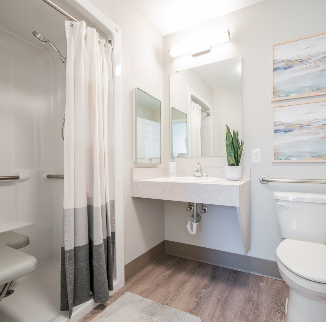 Floating sink with ample clearance beneath for wheelchair accessibility. Standard-height toilet with adjacent grab bars for safety and support. Clean, open layout to accommodate mobility aids and enhance accessibility.