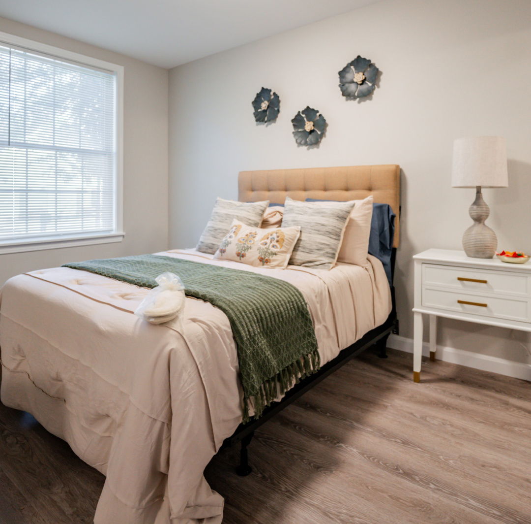 Ample space for queen or full bed. Natural light and large overhead light fixture. White blinds provide privacy while maintaining a clean and modern aesthetic. Storage closet and room for practical shelving needs. Bathroom adjacent.