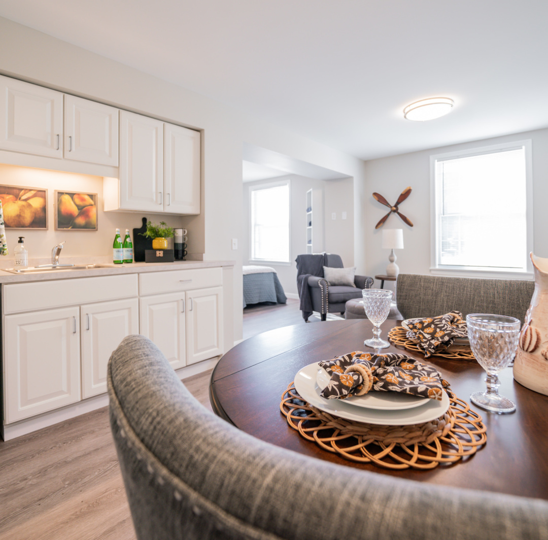 Bright and welcoming with plenty of counter space. White cabinets with ample storage and under cabinet lighting. Mini-fridge and other stainless steel features. Adjacent space for dining table and chairs.